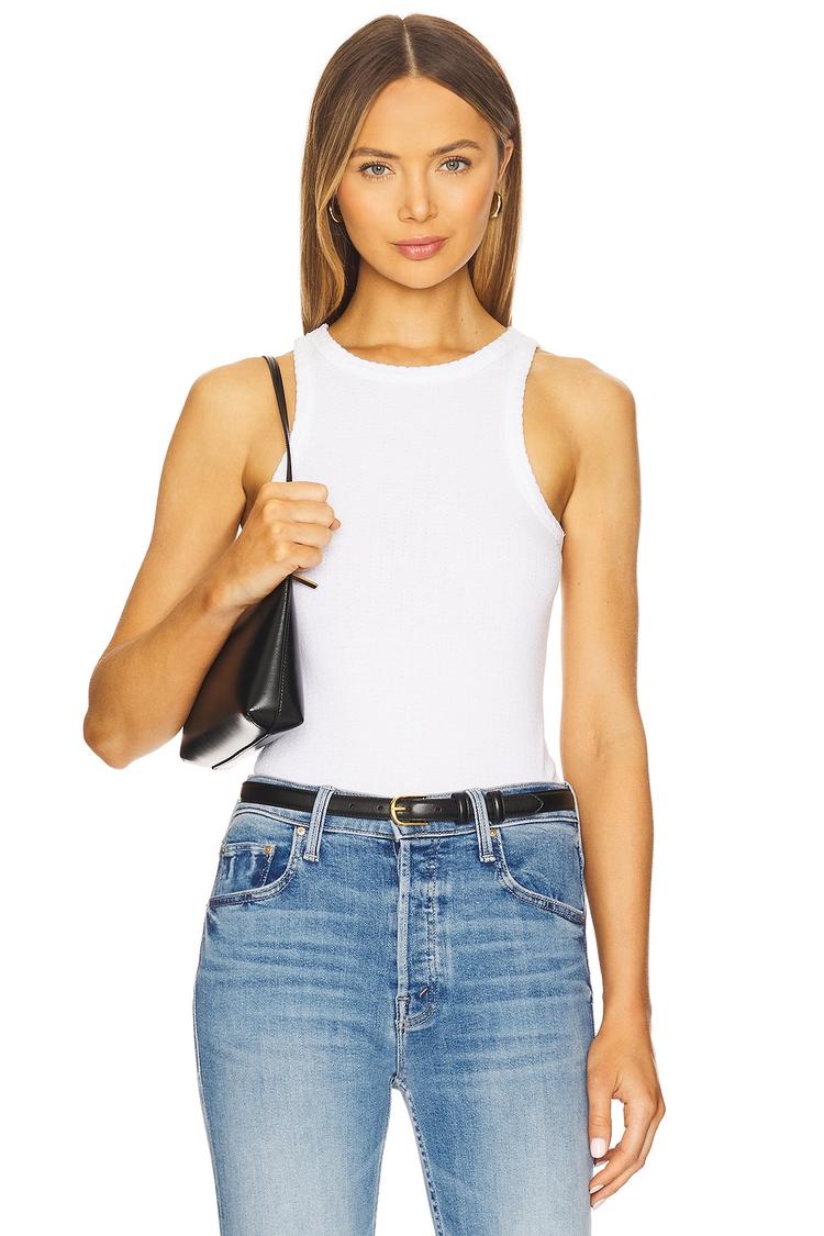 Classic white cotton jersey meets a fitted silhouette in this tank top featuring a crew neck and wide straps. Its hip-length cut and sleeveless style offer a versatile layering piece perfect for casual outings, travel days, or relaxed everyday wear. The semi-sheer, midweight fabric adds a subtle allure while ensuring breathability for warmer seasons. Effortlessly combine this minimalist essential with jeans or shorts for a chic, comfortable look that transitions seamlessly from spring through summer.