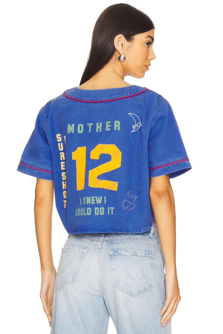A vibrant cropped twill shirt in matte blue features a relaxed, boxy fit with a flattering V-neckline and half-length regular sleeves. Its front button closure complements the casual chic style, enhanced by bold yellow and white graphic prints on both front and back. Crafted from 100% cotton, this midweight piece is ideal for spring through autumn wear. Perfect for casual outings, street style looks, and everyday wear, this versatile top pairs effortlessly with high-waisted denim for an easy, stylish vibe.