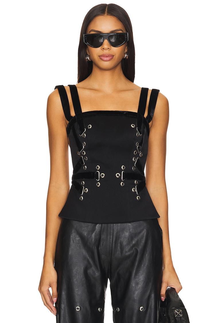 Striking in matte black with a straight neckline and double straps, this fitted corset top features an open back secured with adjustable silver buckles. Crafted from a luxe blend of polyester velour and midweight satin, it showcases edgy silver grommet details on the front and back. The sleeveless, waist-length silhouette offers a modern, chic look perfect for casual outings, night outs, or intimate date nights. Its adjustable back straps ensure a custom fit while the bold design adds a confident statement to your wardrobe.