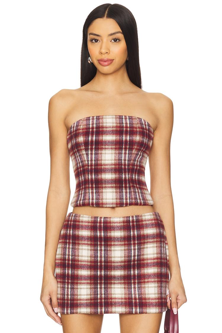 This fitted corset bustier in a soft twill fabric features a classic plaid pattern in rich burgundy, white, and brown hues. Its strapless, sleeveless design with a straight neckline and hidden back zipper with hook and eye closure offers a sleek silhouette and cropped length that pairs well with high-waisted bottoms. Ideal for autumn and winter, this versatile piece suits casual outings, date nights, and night outs, delivering a trendy yet timeless look with comfort and style.