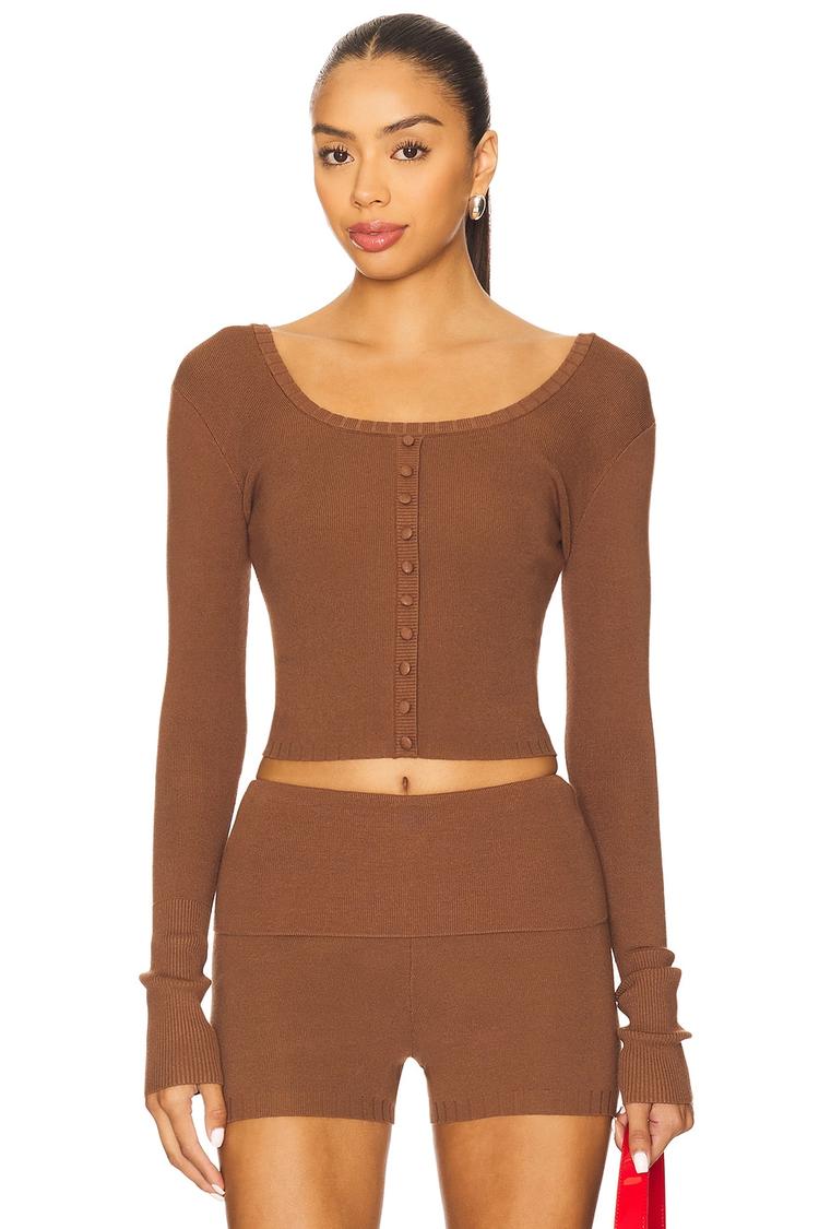 Crisp matte brown midweight knit fabric shapes this fitted cropped top with a classic round neckline and long regular sleeves. The front button closure adds a subtle design detail, while the covered back enhances a sleek silhouette. Ideal for casual outings, brunch dates, or streetwear ensembles in transitional seasons like autumn, spring, and mild winter days, this top blends minimalist style with cozy comfort. Pair it effortlessly with high-waisted bottoms for a chic, modern look that balances form and function.