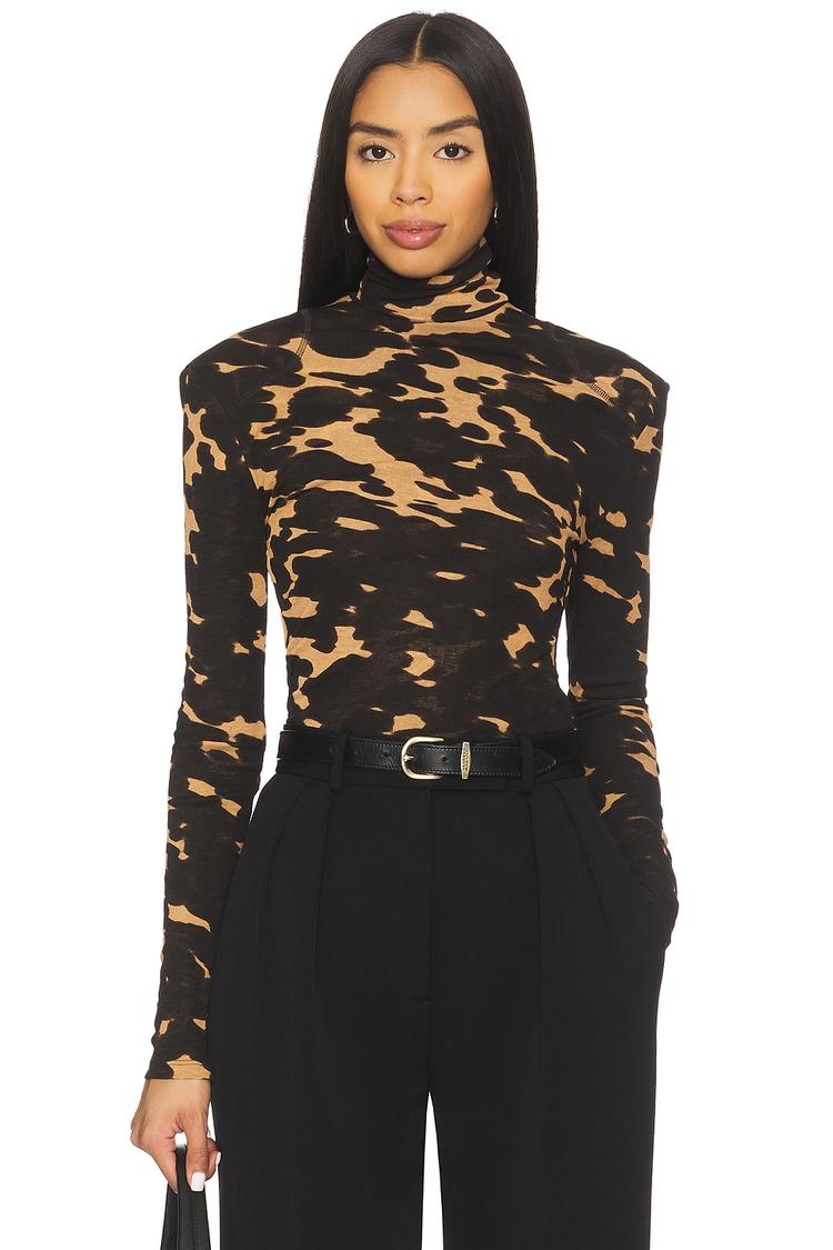 An abstract beige and black pattern adorns this fitted shell top crafted from lightweight polyester mesh. The high neck and long sleeves create a sleek silhouette, perfect for layering or standalone wear. Its hip length and pullover design add to the ease and comfort, making it ideal for casual outings, workwear, or business casual settings. This modern, minimalist piece offers an effortlessly chic vibe suitable for cooler seasons and transitional weather.