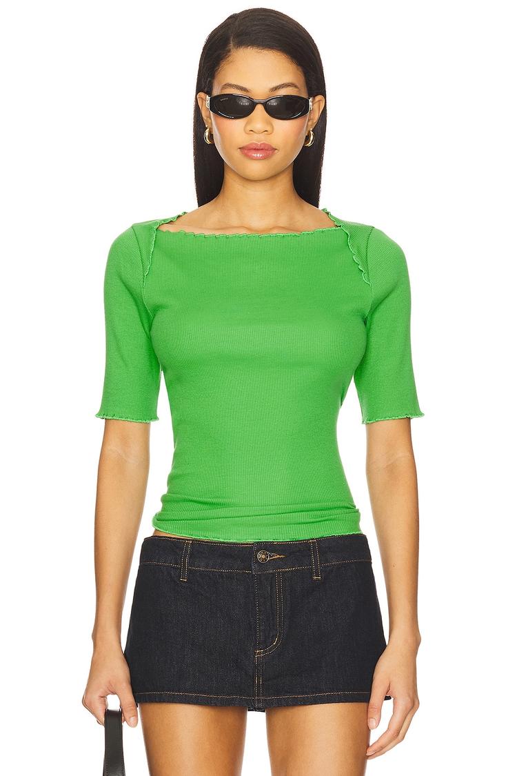 Bright green midweight ribbed jersey fabric defines this slim fit shell top with a flattering boat neck and elbow-length regular sleeves. The scalloped trim along the hem and neckline adds a delicate ruffled border detail that elevates its minimalist, classic style. Designed with pull-on ease and crafted from a cotton-elastane blend, this waist-length top is ideal for casual outings, everyday wear, or workwear occasions. Versatile and comfortable, it pairs effortlessly with skirts or jeans for brunch or relaxed office days.
