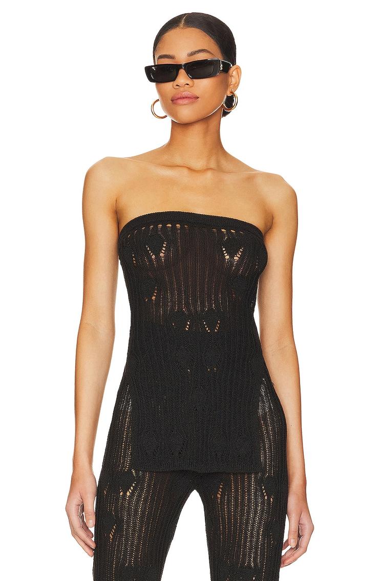 Open knit fabric and a sleek silhouette define this Astra Tube Top in matte black. Crafted from a blend of viscose, cotton, and linen, this hip-length, slim-fitting tube top features a strapless neckline and sleeveless styling, creating an effortlessly sexy and trendy look. The sheer panels offer a bold, fashion-forward edge, perfect for night outs, girls' nights, and party occasions. Easy to wear with a pullover closure, this chic piece brings a fresh vibe to your warm-season wardrobe.