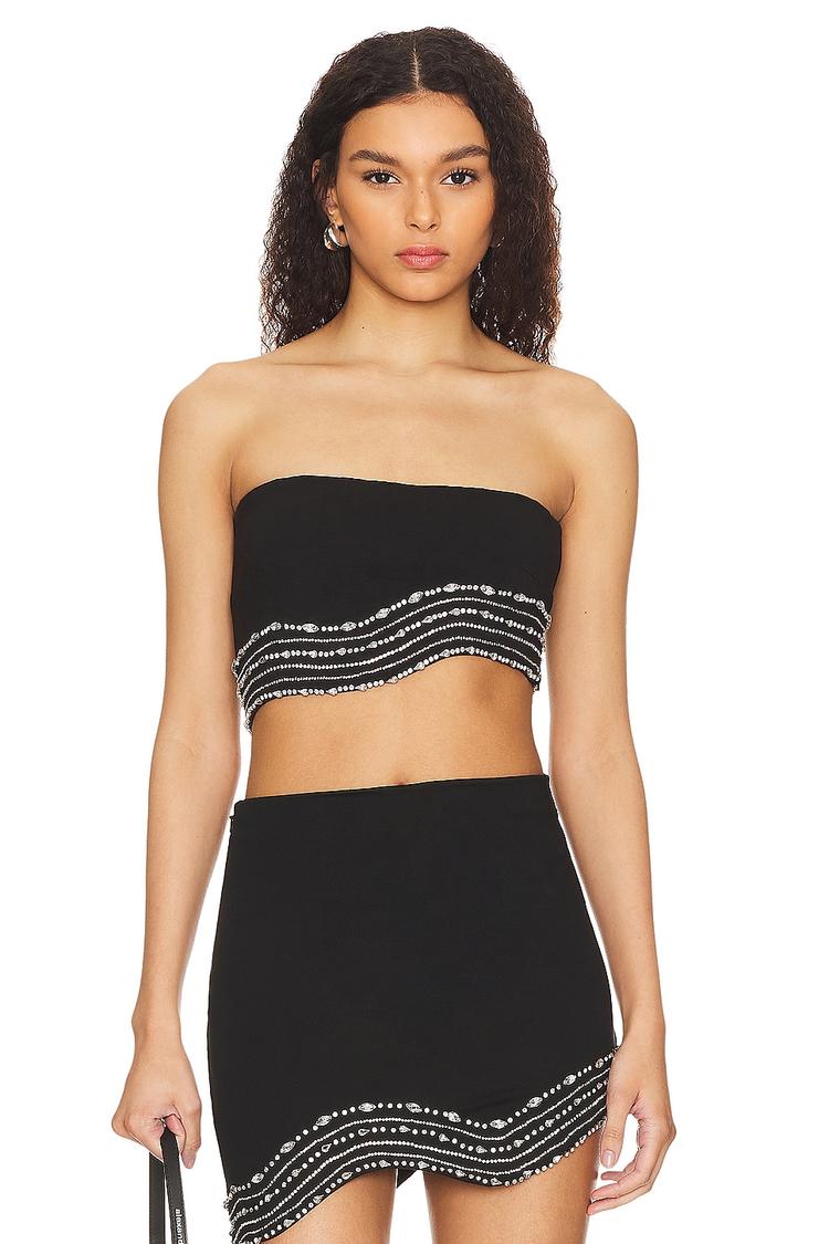 Rhinestone-embellished trim and an asymmetrical hem elevate this fitted cropped bandeau top crafted from smooth ponte fabric. The strapless, sleeveless design with a straight neckline and hidden side zipper closure offers a sleek silhouette perfect for warm weather. Ideal for night outs, cocktail events, and date nights, this chic and trendy piece adds a touch of sparkle and sophistication to your evening wardrobe.