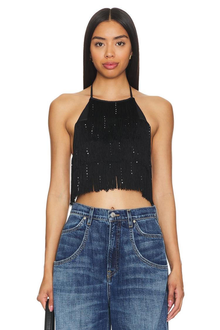 Tiered fringe adorned with heat-stamped crystals adds a sparkling edge to this slim-fitting cropped top crafted from smooth polyester. The halter neckline and open back with an adjustable hook closure enhance its sexy silhouette, perfect for summer nights out, date nights, or girls' night gatherings. Sleeveless and strapless styling emphasize an effortless, trendy vibe that pairs beautifully with high-waisted jeans or skirts for a standout evening look.
