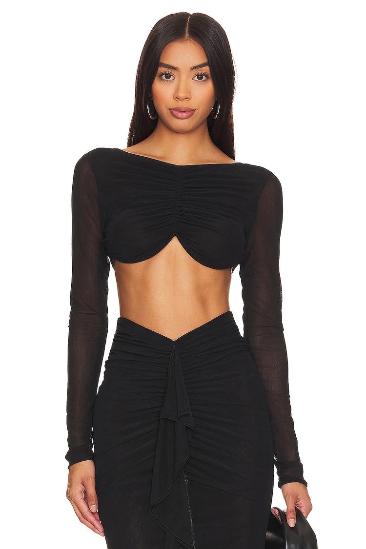 Sleek matte black mesh fabric shapes this fitted cropped top featuring long regular sleeves and a distinctive straight neckline. The ruched bodice with an underwire bust provides structured support, while the open back with a hook and eye closure adds an alluring touch. Perfectly suited for night outs, date nights, or girls night events, this chic and sexy piece offers a modern silhouette that highlights confidence and style. Its breathable mesh composition ensures comfort and versatility across seasons.