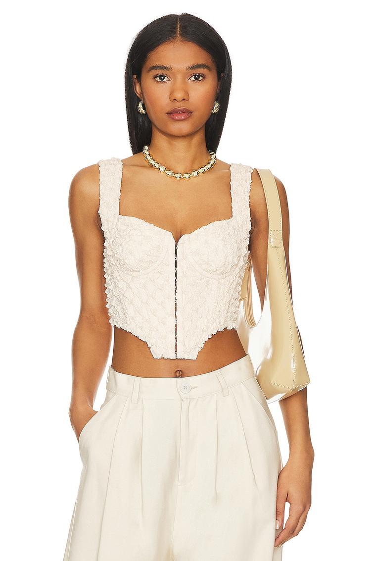 Textured jersey fabric and a boned bodice define this fitted corset with a flattering sweetheart neckline and wide straps. The cropped length and front hook closure enhance its modern, chic silhouette, making it an ideal choice for summer and spring outings. Perfect for casual wear, brunches, date nights, or night outs, this off-white corset adds a sophisticated yet sexy edge to your wardrobe.