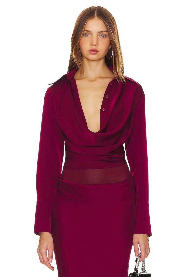Luxurious satin in a rich burgundy hue defines this elegant blouson top, featuring a draped neckline that exudes sophistication. Its slim fit and long blouson sleeves with button cuffs create a refined silhouette, perfect for cocktail parties, festive nights out, and holiday celebrations. The waist-length hem and front button closure add classic detailing, making it a polished choice for elevated evening wear.