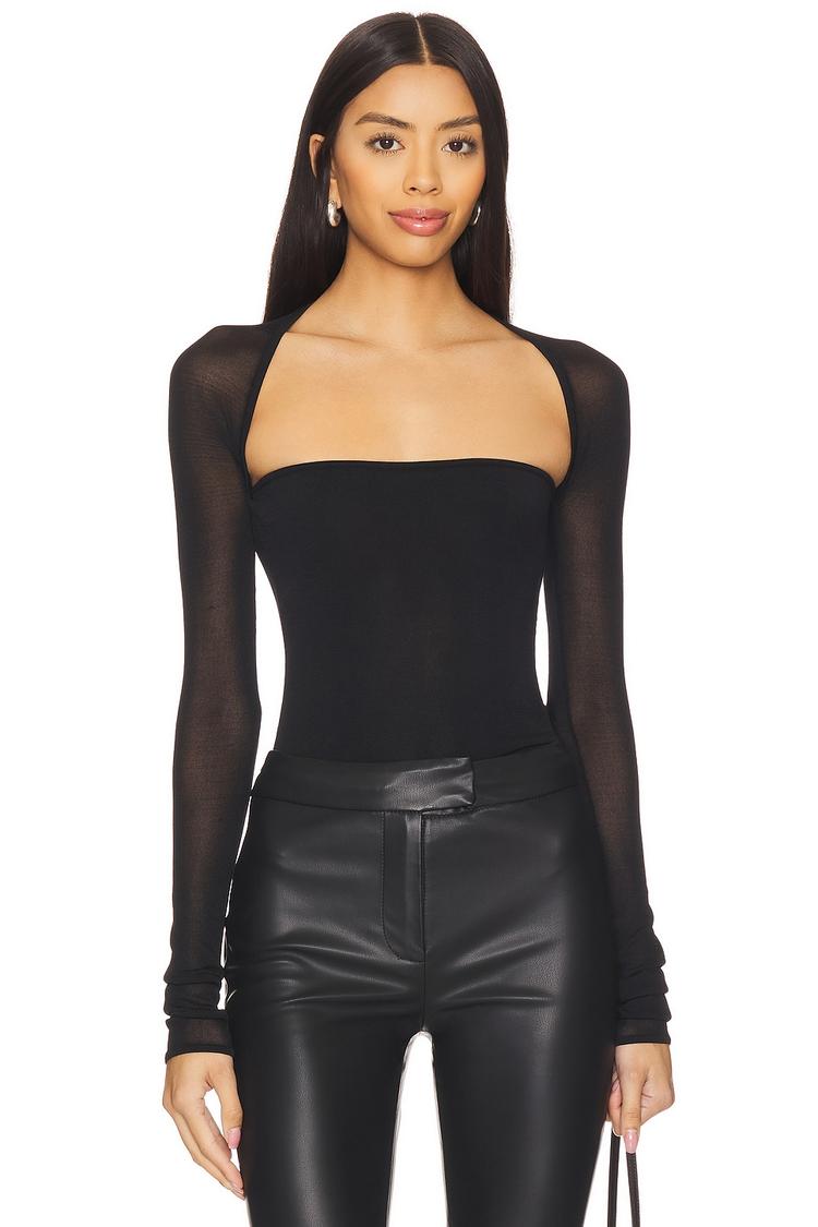 Sleek black bandeau top crafted from a midweight viscose-nylon knit offers a fitted silhouette with long regular sleeves and a straight neckline for a modern, minimalist vibe. The pullover design and hip length ensure easy wearability, making it a versatile choice for casual outings, date nights, or evening events. Its covered back and solid black shade lend an elegant, chic edge perfect for layering or standalone style.
