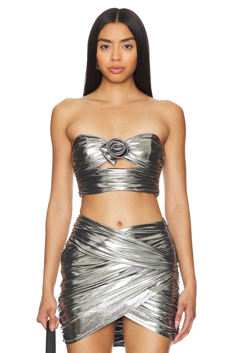 Shimmering metallic silver fabric and delicate ruching create a striking fitted bandeau top with a straight strapless neckline. The cropped length and rosette front detail add bold, sexy appeal, perfect for summer nights out, cocktail parties, or girls' night events. Crafted from a polyester blend with viscose lining, it features an invisible back zipper closure for a sleek finish. This trendy chic piece elevates your evening wardrobe with its flattering silhouette and eye-catching texture.