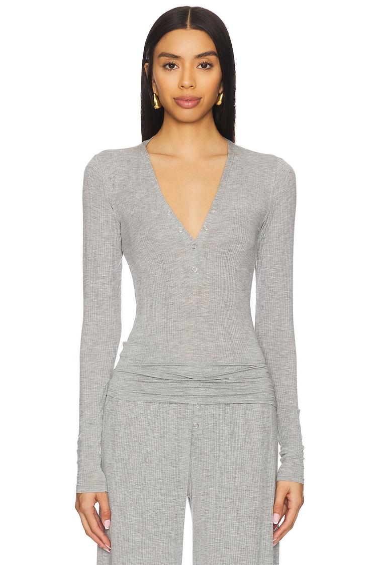 Soft ribbed modal fabric and a fitted silhouette define this Henley top, featuring a flattering V-neck with a partial snap button front closure. Its long regular sleeves and waist-length cut make it an ideal choice for casual, loungewear, or everyday use. The minimalist gray tone and comfortable stretch fabric provide versatility for year-round wear, pairing effortlessly with a variety of bottoms for a chic, understated look.