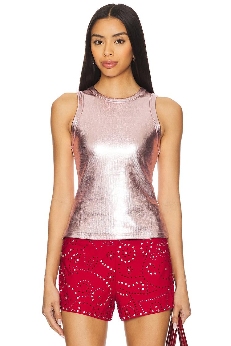 Shimmering light pink metallic coated jersey fabric defines this fitted tank top with a classic round neckline and wide straps, offering a sleek sleeveless silhouette that hits at the hip length. Crafted from a soft cotton-polyester blend, its pullover style ensures easy wear. This modern minimalist tank is ideal for warm spring and summer days, making it a versatile choice for casual outings, brunch dates, or vacation wear. The subtle logo detail at the back adds a touch of branded charm without overpowering the design.