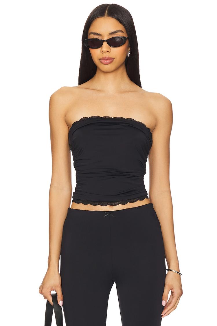 Ruched nylon-elastane fabric and a slim, cropped silhouette define this chic tube top. The strapless neckline and sleeveless styling create a sleek, minimalist look, while the scalloped hem with delicate ruffle detailing adds a subtle feminine touch. Ideal for warmer seasons like spring and summer, this versatile piece is perfect for casual outings, brunch dates, or a night out. Its slip-on closure ensures easy wearability, making it a trendy addition to any wardrobe seeking both comfort and style.