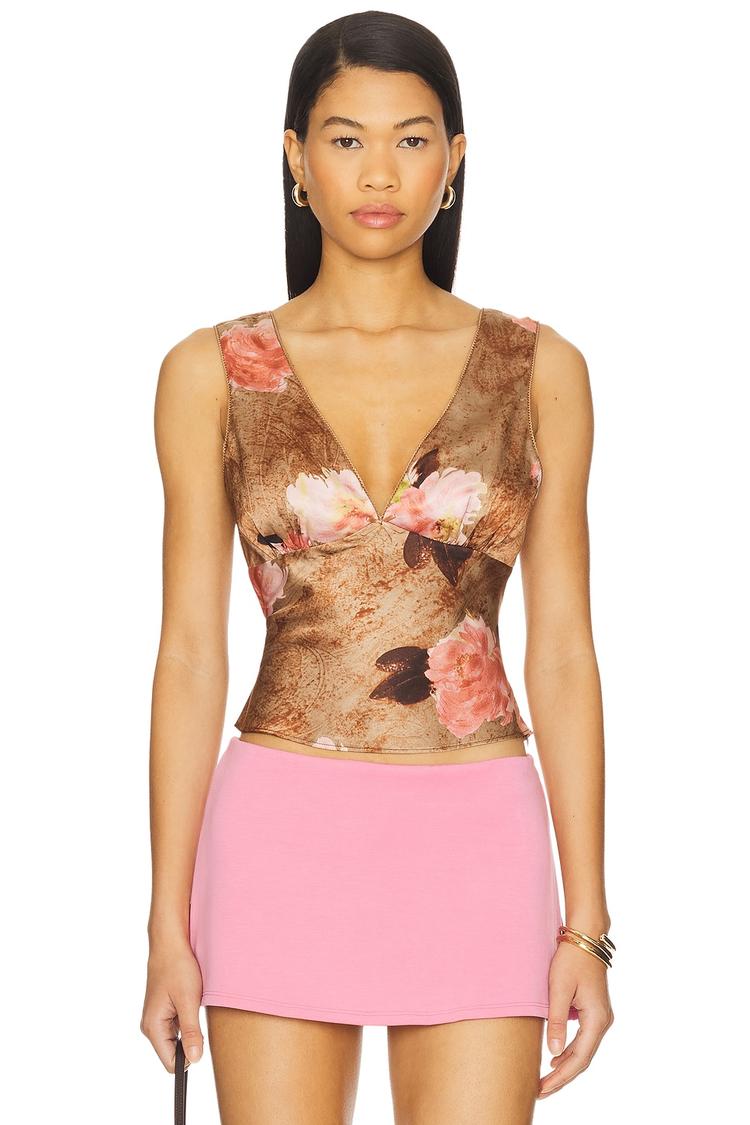 Soft charmeuse fabric and a fitted silhouette define this Celia Wrap top with a flattering V-neck and sleeveless wide straps. The all-over floral print in muted browns and pinks creates a romantic yet modern vibe, enhanced by the open back with a self-tie accent that adds subtle allure. Its waist-length cut makes it ideal for pairing with skirts or trousers for versatile looks suited to casual days, brunch dates, or night outs in warm spring and summer seasons.