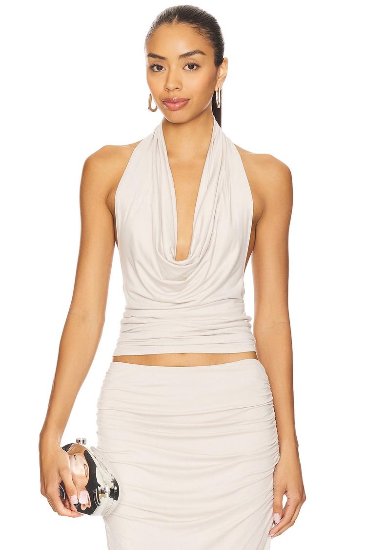 Soft cream jersey fabric with a flattering halter neck silhouette defines this fitted cropped top. The adjustable tie-back straps and ruched detailing at the front and back enhance its sleek, sexy appeal. Ideal for spring and summer nights, this modern top pairs perfectly with skirts or high-waisted bottoms. Designed for confident evenings out, date nights, or girls' night adventures, it combines comfort with contemporary style for a standout look.