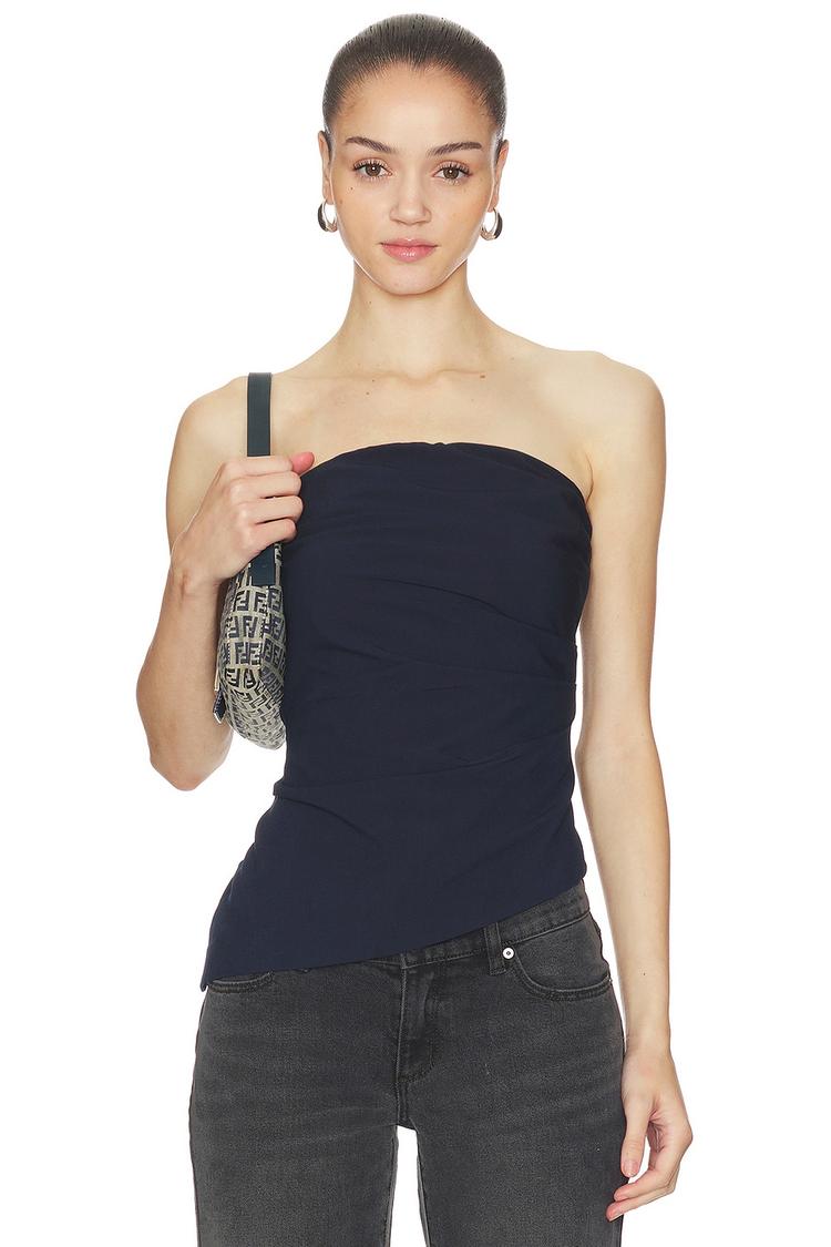 Gathered material with a subtle ruffle effect and an asymmetrical hem add a chic touch to this fitted bandeau top in matte dark blue. Featuring a straight, strapless neckline and a side zipper closure, its modern silhouette is perfect for warm spring and summer days. Ideal for casual outings, date nights, or evening events, this versatile top blends comfort with style effortlessly.