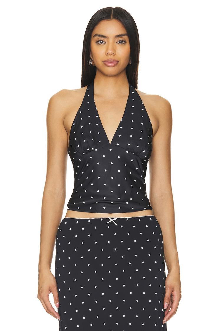 A sleek halter neck cropped top crafted from a stretchy polyester-spandex blend offers a fitted silhouette that flatters the figure. The matte black fabric is adorned with an all-over white polka dot pattern, adding a playful yet sophisticated touch. The sleeveless, strapless design with tie-back closure enhances its sexy and trendy vibe. Ideal for warm spring and summer evenings, this chic top is perfect for casual outings, night outs, or date nights, combining comfort and style effortlessly.
