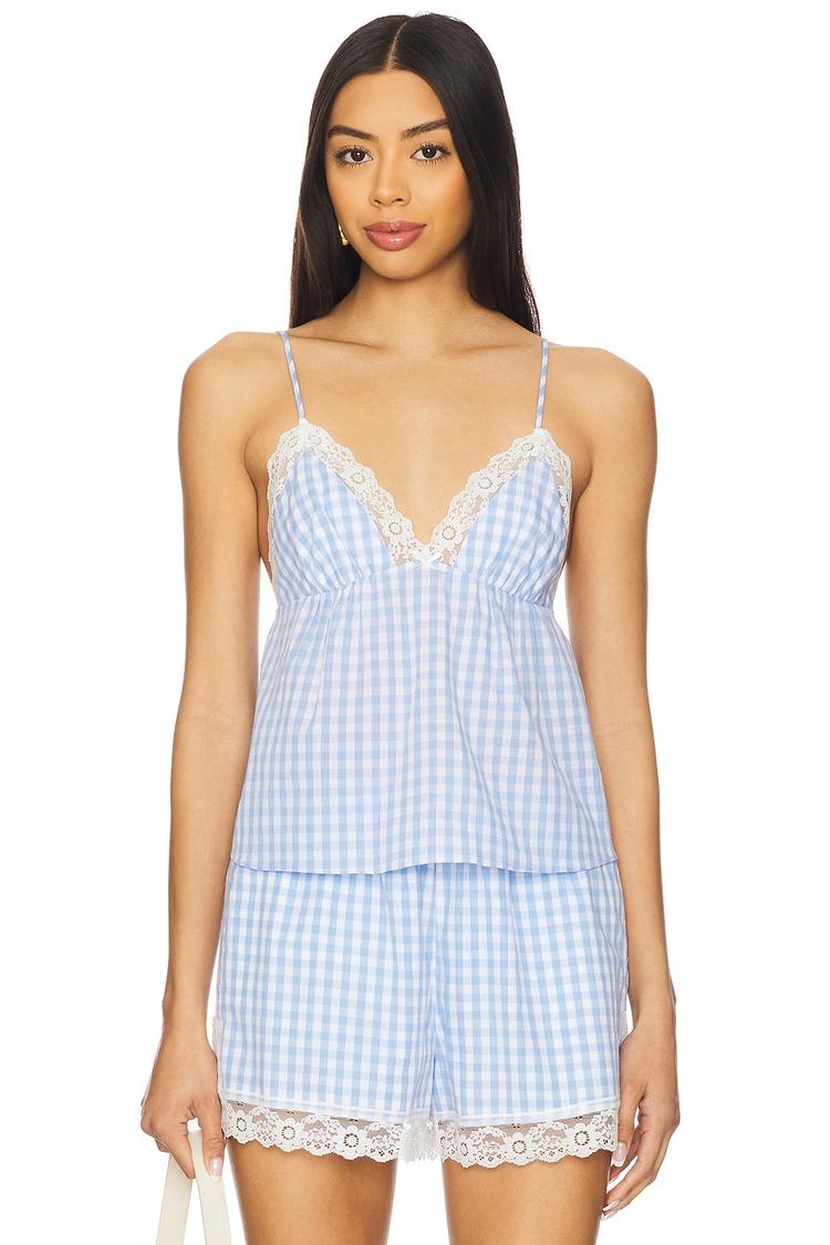 Soft lightweight cotton in a relaxed fit creates an airy camisole perfect for warm days. The hip-length silhouette features delicate white lace trim along the V-neckline and adjustable spaghetti straps for comfort. The all-over light blue and white gingham pattern adds a cute, casual chic vibe ideal for loungewear, sleepwear, or relaxed casual outings in spring and summer. Slip on this charming top for effortless style and breathable comfort during your day or night at home.