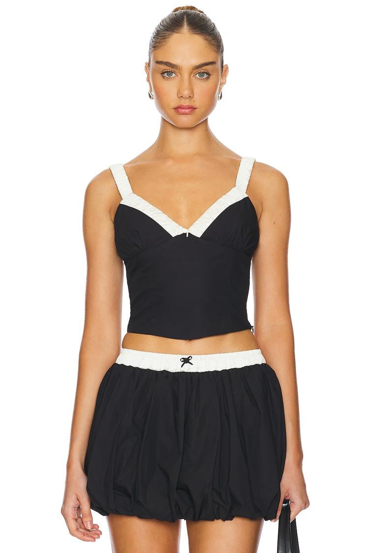 The Serafina Corset top features a fitted, cropped silhouette crafted from breathable cotton blended with polyester and elastane for comfort. Its striking black base is accented with contrasting white wide straps and a delicate bow at the sweetheart neckline, adding a chic, elegant touch. This sleeveless piece closes with a hidden side zipper, offering a sleek covered back. Ideal for spring and summer, it effortlessly suits casual days, brunch outings, or stylish date nights with its classic, refined vibe.