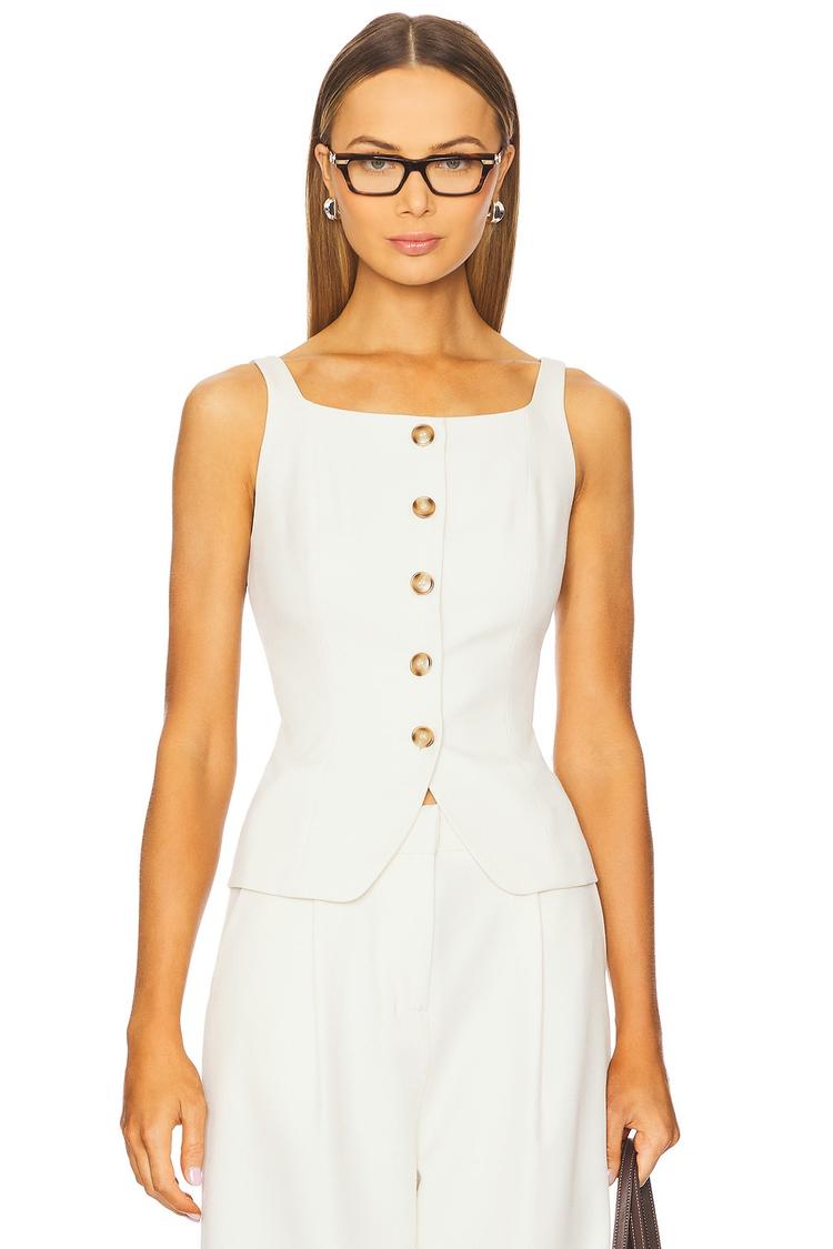 Crisp white fabric and a flared waist define this Nicholas Sabina Tank. Crafted from a midweight polyester-linen blend with elastane for comfort, it features a square neckline and wide straps that offer a clean, elegant silhouette. The front button closure adds a classic touch, making it suitable for casual days, workwear, or business casual occasions. Its waist-length design ensures versatility for pairing with tailored pants or skirts, perfect for spring through autumn seasons.