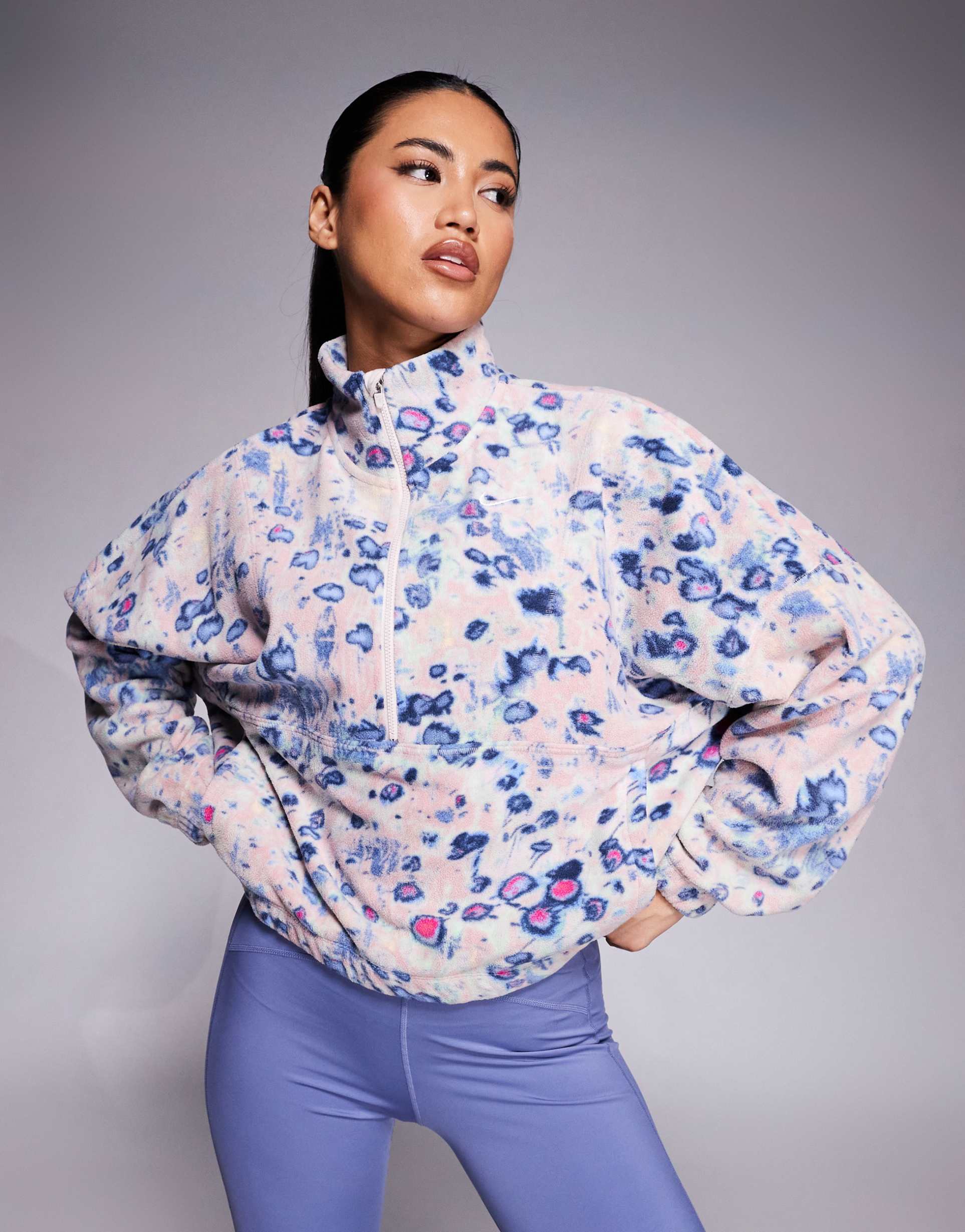 Soft polar fleece fabric with a fuzzy texture and all-over blue floral print defines this Nike Training pullover top. Featuring a relaxed fit, funnel neck, and drop-shoulder long sleeves, it offers a cozy yet sporty silhouette. The half zip closure and front pouch pocket add functional style, while the embroidered Nike logo enhances the sporty chic vibe. Ideal for casual wear, workouts, and athleisure looks during cooler seasons, this hip-length top blends comfort with performance-ready design for versatile everyday wear and travel.