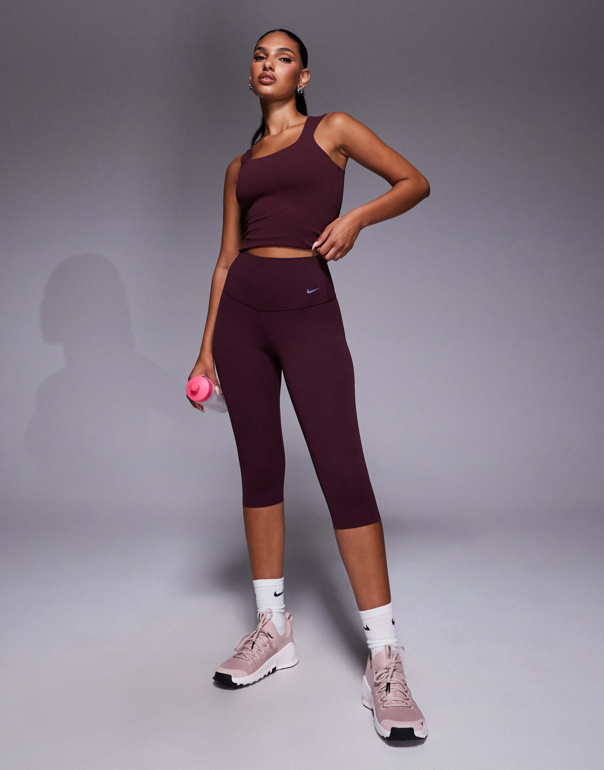 Square neck and racerback design define this burgundy tank top crafted from breathable cotton with Nike Dri-FIT technology. Its slim, cropped fit ensures a sleek silhouette perfect for workouts, athleisure days, or travel. The sleeveless, strapless styling offers freedom of movement and a sporty chic vibe, making it an ideal layering piece or standalone top for warm seasons. Combining functionality and style, this tank keeps you cool and dry while elevating your activewear wardrobe.