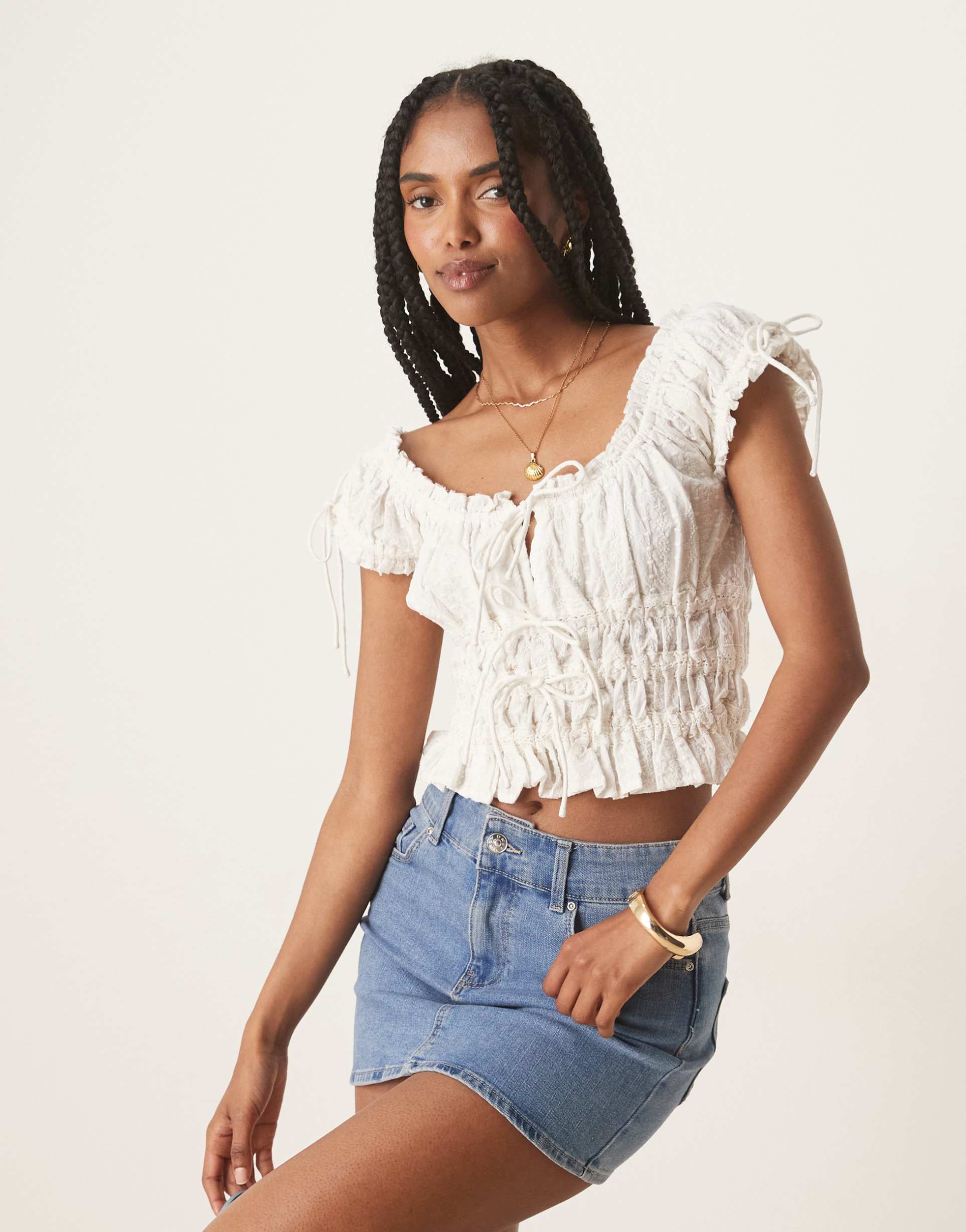 Soft white viscose fabric and delicate ruching create a charming cropped top perfect for warm weather. Featuring a scoop neckline and cap sleeves with ruffle trims, this regular fit blouse offers feminine tiers and a tie-up detail at the waist for added flair. Its versatile design suits casual outings, brunch dates, and everyday wear with a romantic, casual chic vibe.