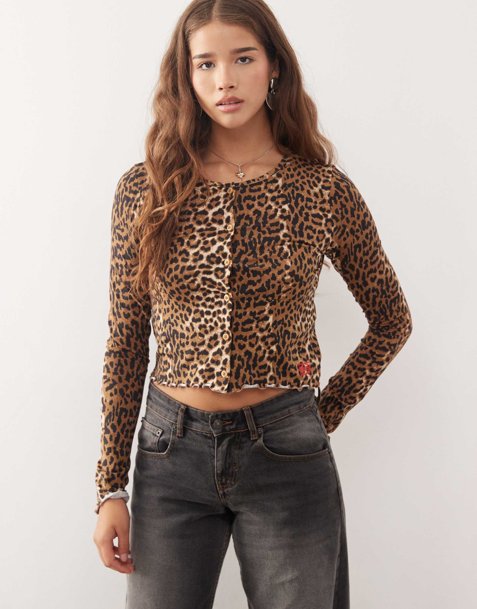 Lively leopard print and a classic crew neck highlight this cropped button-up top crafted from a fine cotton-elastane knit. Its regular fit and long sleeves with delicate lettuce edges offer a trendy yet comfortable silhouette perfect for casual outings, streetwear looks, or everyday wear. The button placket adds a touch of structure, while the playful ruffles along the borders and sleeves bring subtle detail to this versatile piece suitable for autumn through spring.