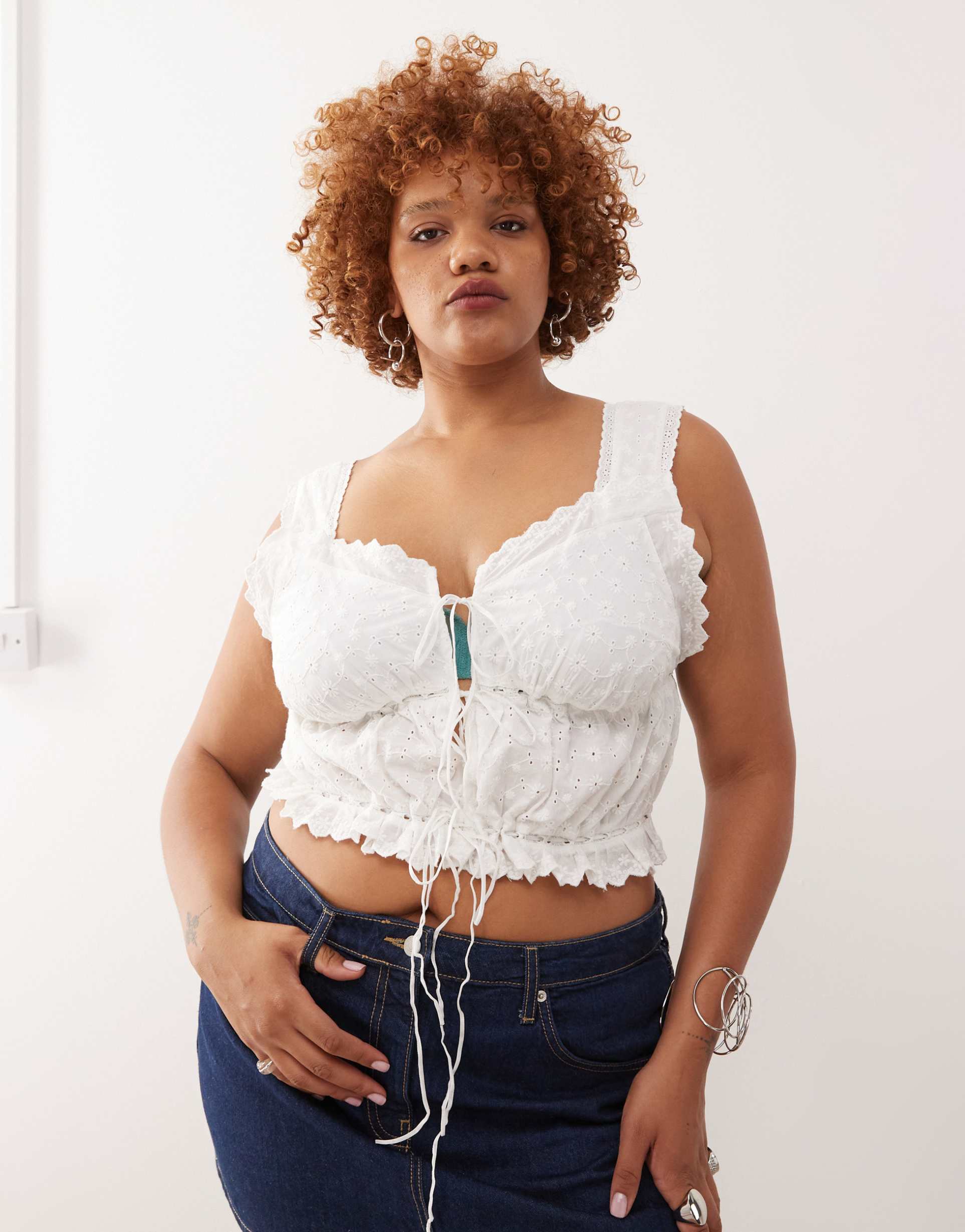 NOISY MAY CURVE TIE FRONT BRODERIE TOP IN WHITE