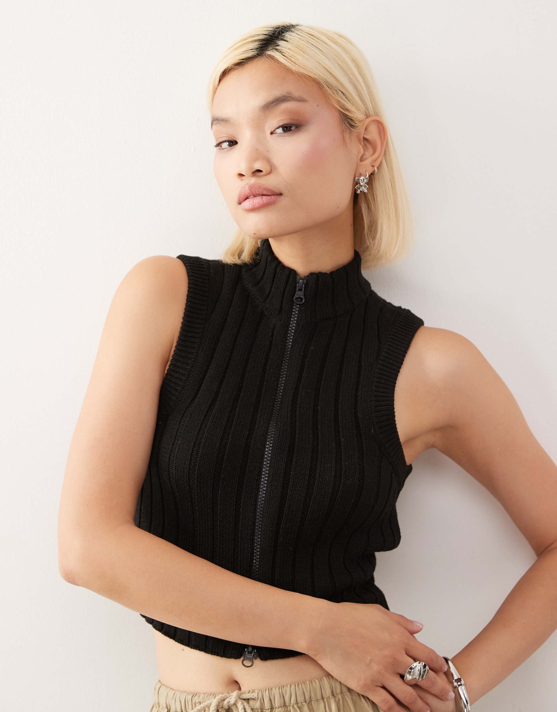 NOISY MAY HIGH NECK ZIP UP KNIT TANK TOP IN BLACK