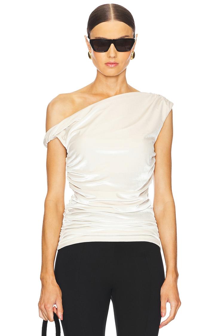 The Becks Top radiates modern sophistication with its matte white, fitted silhouette and asymmetric neckline. Crafted from a lightweight polyester-spandex jersey, it features ruched sides that enhance its sleek, hip-length profile. Wide straps and sleeveless styling emphasize a sexy, chic vibe perfect for spring and summer outings. Ideal for casual gatherings, date nights, brunches, and nights out, this pullover top blends comfort with contemporary elegance to elevate your wardrobe essentials effortlessly.