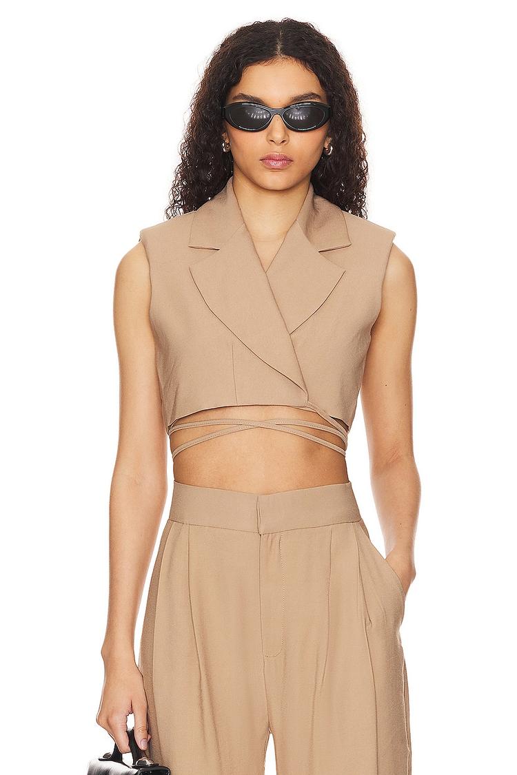 Effortlessly chic and sun-ready, this Hailey Crop Top in warm beige brings architectural polish to everyday looks. Cut in a cropped silhouette from twill-woven 100% polyester, the sleeveless bodice features blazer-inspired notched lapels and a sleek wrap-around front that closes with a dual-breasted front button and a back tie for an adjustable, secure fit. The neutral hue and tailored lines pair beautifully with high-waisted trousers or wide-leg pants for a refined co-ord, or dress it up with a mini skirt for date-night polish. A versatile, modern top that moves from desk to dinner with ease.