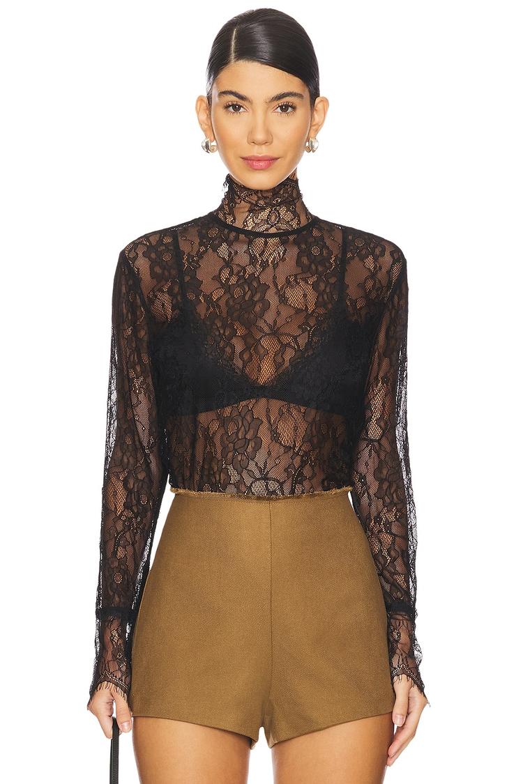 Delicate floral lace in sheer black nylon-spandex blend creates a slim fit shell top with a sophisticated high neckline and long sleeves. The hip length hem and keyhole back with button closure add refined details to this elegant, modern piece. Perfect for date nights, cocktail events, and semi-formal occasions, this chic top elevates your evening wardrobe with a sexy, yet tasteful silhouette.