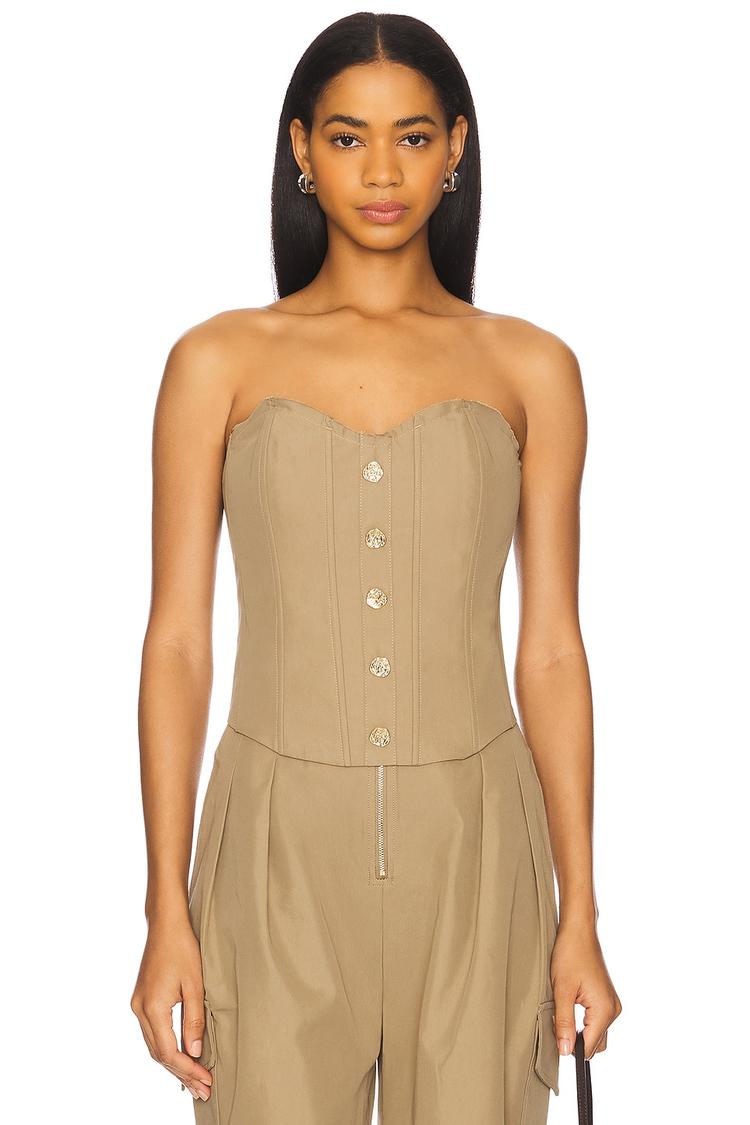 Structured boning and a tailored fit define this elegant strapless corset in matte tan twill fabric. Featuring a straight neckline and gold-tone button accents down the front with a back zip closure, this waist-length piece exudes modern sophistication. Ideal for spring through autumn, it pairs effortlessly for casual outings, date nights, and chic brunches. The midweight cotton-polyester blend ensures comfort while maintaining shape, making it a versatile addition to elevate your wardrobe with refined, contemporary style.