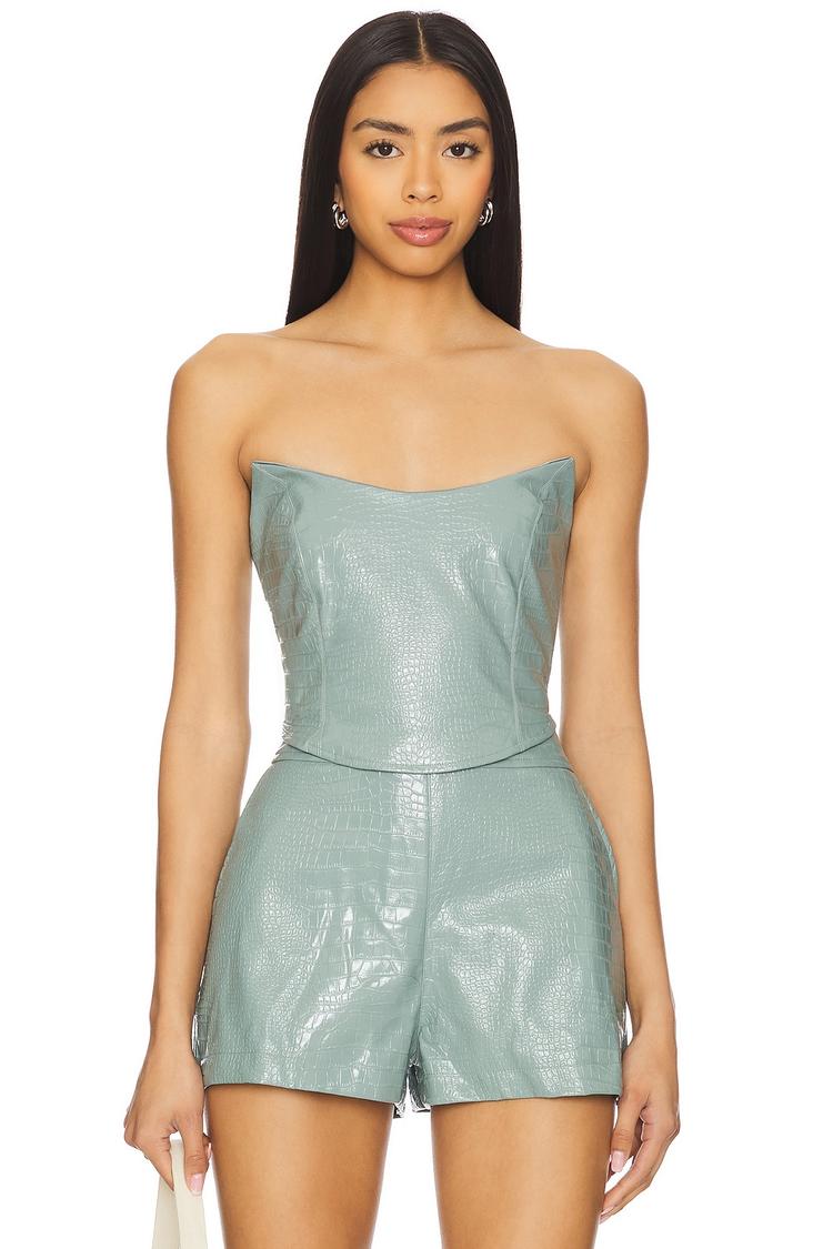 The Shiloh Bustier Top showcases a sleek, fitted silhouette crafted from croc-embossed faux leather in a muted light green hue. Featuring a strapless, straight neckline and waist-length cut, this corset-style top is secured with an exposed back zipper for a modern edge. Its sleeveless design and structured fit make it ideal for spring and summer wear. Perfect for casual outings, date nights, or a night out, this chic and sexy piece brings a contemporary vibe with luxurious texture and standout detailing.
