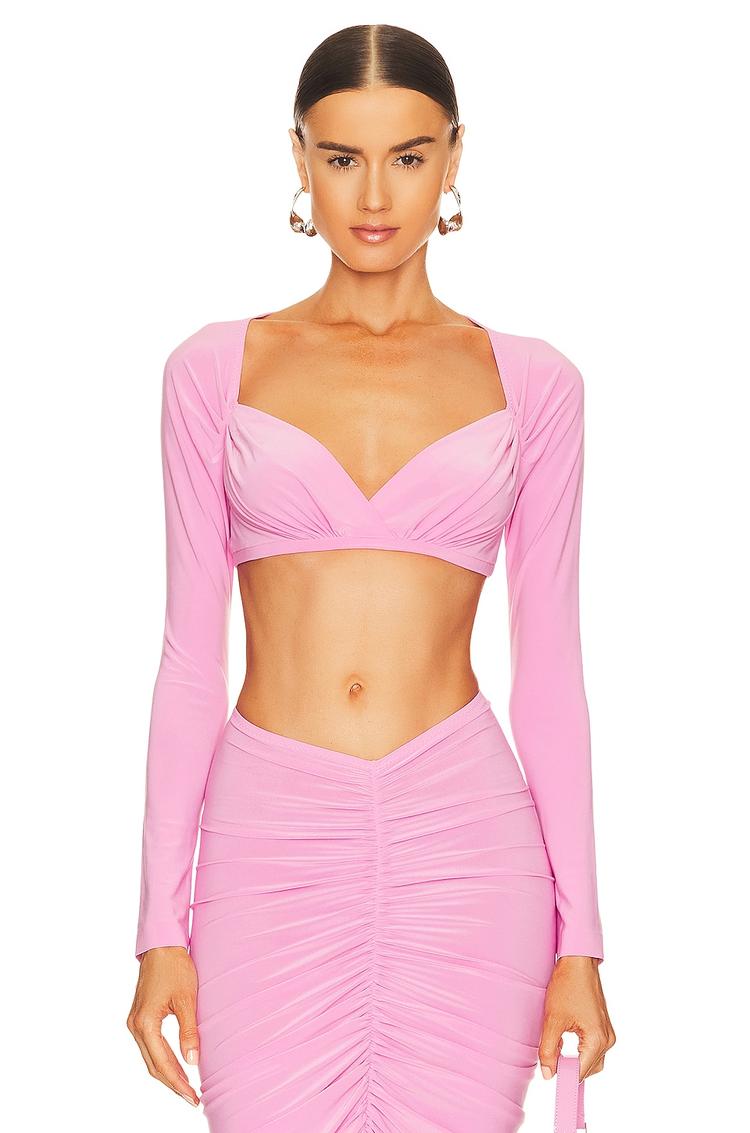 Feel the breeze and flirtatious charm of pink in this cropped sweetheart top. With a surplice bust, long sleeves, and an open back, it creates a playful, feminine silhouette. Crafted from draped jersey with a 95% polyester, 5% spandex blend, it moves with you and hugs in all the right places. A non-slip silicone grip lining at the hem helps keep the top in place, while the wrapped drape flatters every curve. Style it with a high-waisted skirt or jeans for date nights, vacations, or nights out—effortless confidence, all season.
