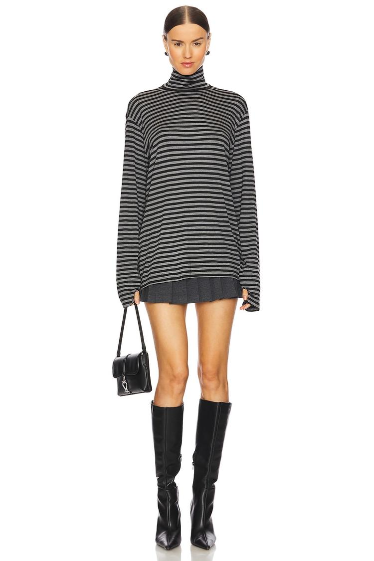 A cozy and effortlessly chic tunic-length top featuring a classic turtle neck and long sleeves for cooler seasons. Crafted from a stretchy viscose-elastane blend, its easy fit silhouette drapes comfortably over the body, accented by subtle black and gray stripes all over. The pullover style and covered back make it simple to wear for casual outings, travel, or laid-back workwear days. Layer this minimalist, modern piece with boots for a refined autumn or winter look that balances comfort and style with ease.
