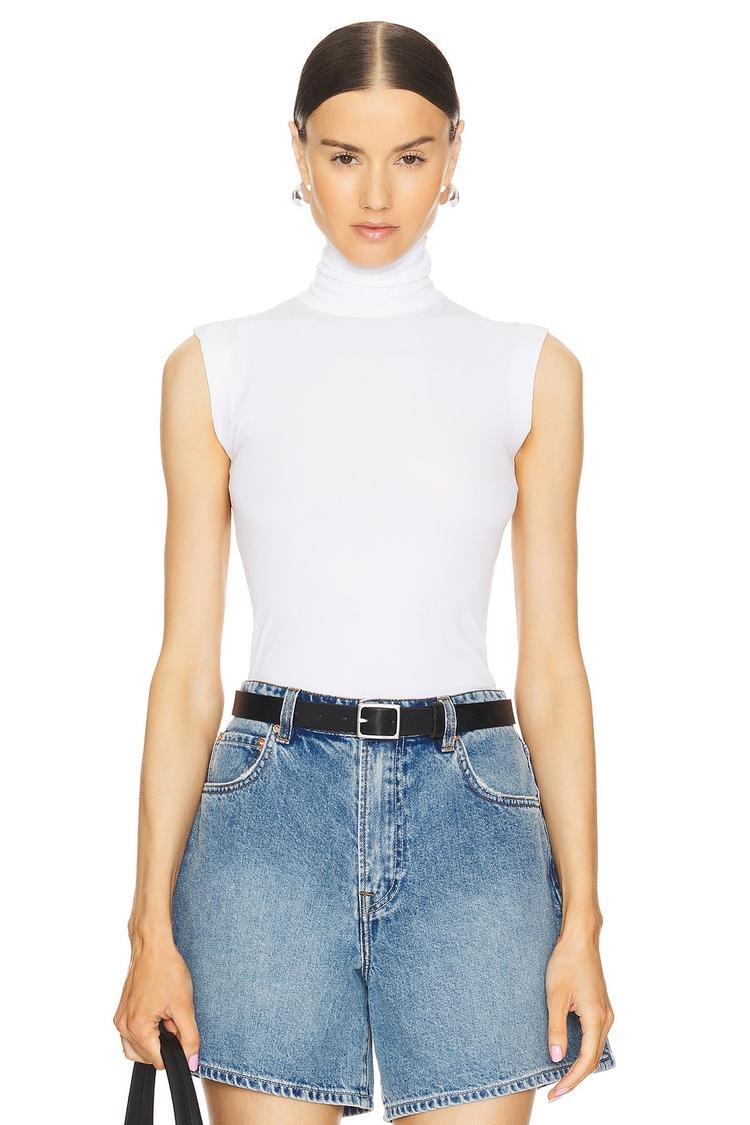 A sleek and slim fit sleeveless tank with a classic white hue and a refined turtleneck collar. Crafted from smooth polyester-spandex jersey knit, this hip-length top offers a clean silhouette with a concealed back zipper closure for a polished look. The minimalist style and versatile design make it ideal for casual outings, workwear, and business casual settings, providing a modern yet timeless appeal that transitions seamlessly across seasons.