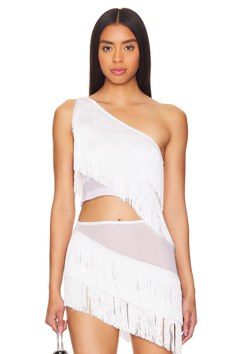 Asymmetric neckline and one-shoulder strap define this cropped top with tiered fringe detailing that adds dynamic movement. Crafted from a sleek blend of nylon, elastane, and polyester mesh, it offers a loose fit that pairs perfectly with summer evenings, casual outings, or a stylish night out. The all-over white fringe design infuses a modern, sexy vibe that stands out effortlessly, making it an ideal choice for date nights and trend-forward wardrobes.