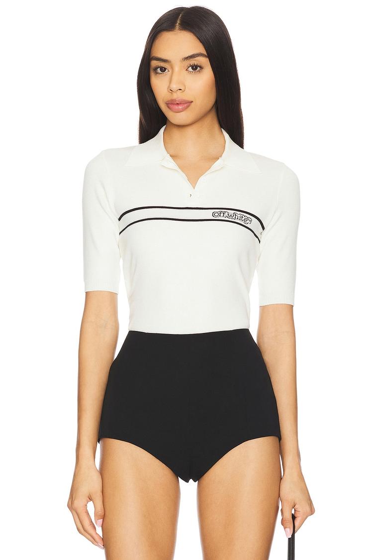 Crisp white viscose-polyester knit forms this fitted polo with a classic collared neckline and elbow-length regular sleeves. The hip-length silhouette features a partial front button closure and distinctive black logo stripes across the front bodice, offering a minimalist yet business chic aesthetic. Ideal for casual days at the office, business casual meetings, or stylish everyday wear, this midweight polo blends comfort and sophistication effortlessly.