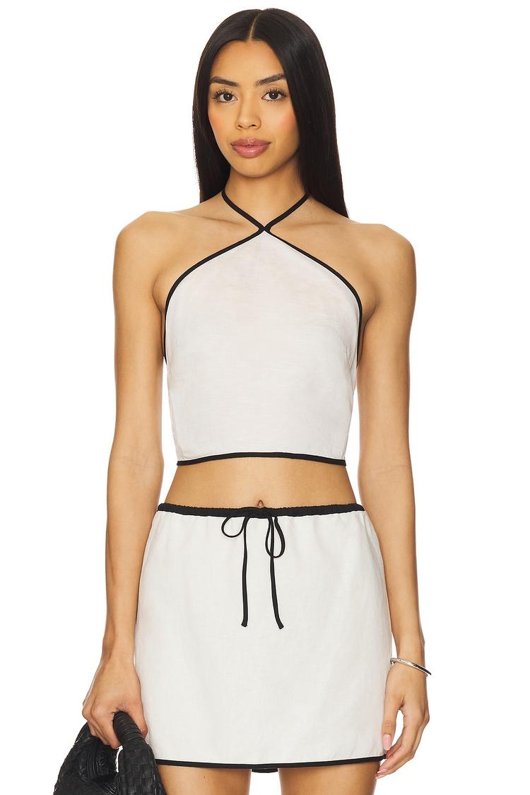 Breezy and chic, this cropped halter top features a slim fit crafted from a lightweight linen and lyocell blend with a semi-sheer texture perfect for warm weather. The minimalist design is elevated with black trim and a tie-back closure that adds adjustable comfort and style. Its sleeveless, strapless halter neckline and midriff-baring length make it ideal for casual outings, beach days, and vacation adventures. Embrace effortless summer sophistication with this versatile top that pairs beautifully with skirts or shorts for brunch or relaxed daytime events.