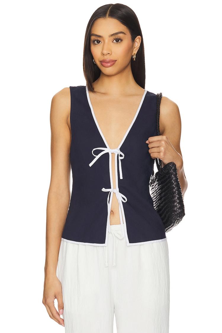 Soft linen blended with lyocell brings breathable comfort to this slim-fitting tank top. Its sleeveless design with wide straps and a deep V-neckline framed by crisp white contrast trim creates a fresh, minimalist look. The hip-length cut and front tie-up closures add casual charm, perfect for warm weather occasions like brunch, casual outings, or vacation days. With a covered back and clean solid dark blue tone, this versatile piece pairs effortlessly with light bottoms for an easy, chic style.