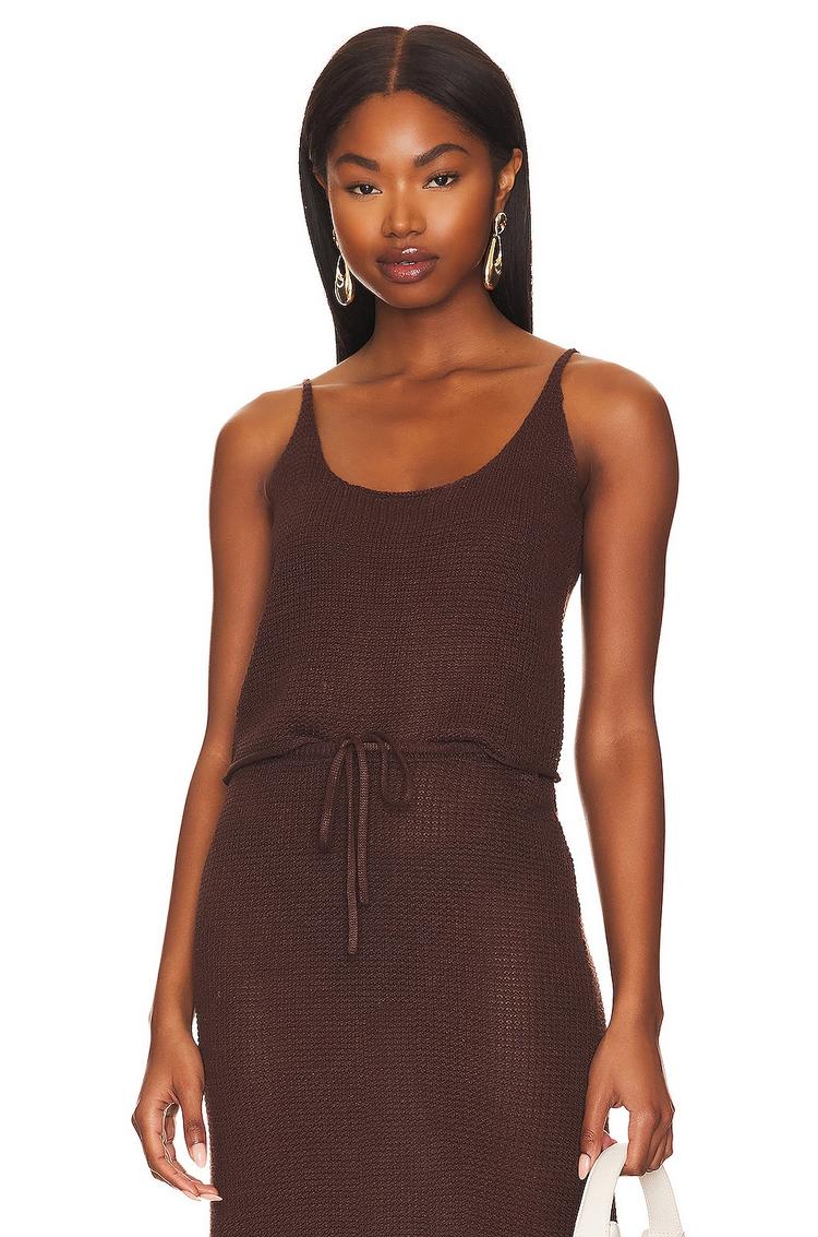 Softly textured linen and a breathable open knit define this regular fit tank top, perfect for warm days. Featuring a flattering scoop neckline and delicate spaghetti straps, this sleeveless piece reveals a dramatic open back for an effortlessly chic summer look. Its hip length and slip-on design provide comfort and ease, ideal for casual outings, brunch dates, or vacation relaxation. The matte brown hue adds understated sophistication while the sheer knit fabric offers a light, airy feel that complements seasonal warm-weather styling.