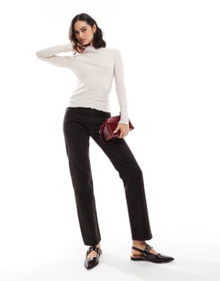 Soft rib knit fabric and a high neck combine with a regular fit to create a versatile beige top perfect for layering. The long sleeves with classic regular styling and delicate lettuce-edge trim add subtle detail to this hip-length silhouette. Crafted from a stretchy blend of polyester, viscose, and elastane, this minimalist top suits casual days, workwear, and business casual occasions with ease.