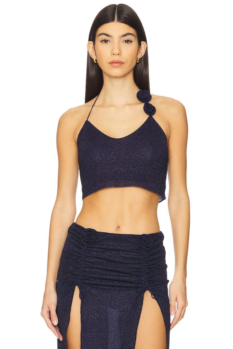 Shimmering metallic jersey fabric and a fitted silhouette define this chic cropped tank with a halter neck and sleeveless design. The tie-back closure and rosette accents on the shoulder straps add a delicate bow detail, enhancing its trendy summer appeal. Perfect for casual outings, brunch dates, or a night out, this lightweight tank offers both style and comfort in a deep shimmering blue hue.