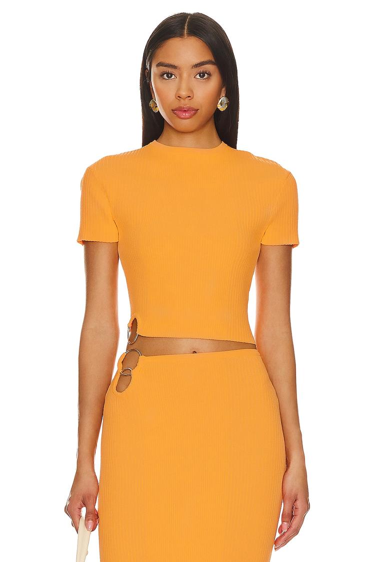 Bright matte orange ribbed jersey fabric shapes this fitted cropped top with a high neck and half sleeves, creating a sleek and modern silhouette. The silver-tone ring buckle detail at the side hem adds a subtle yet stylish accent. Ideal for casual outings, brunch, or date nights, this minimalist piece blends comfort and chic style effortlessly. Its breathable viscose-nylon blend makes it perfect for spring through autumn wear, offering versatility across seasons and occasions.