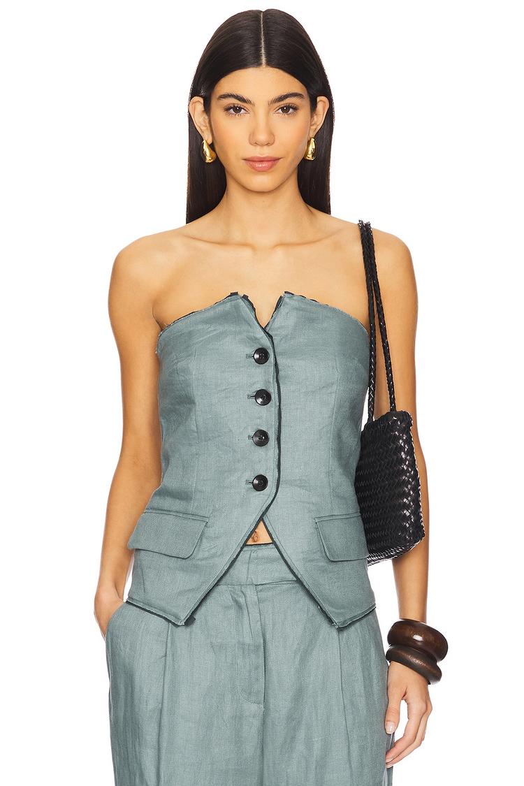 Structured with boned sides and crafted from midweight twill linen, this fitted corset top features a straight neckline and strapless sleeveless design for a sleek silhouette. Its matte dusty blue hue enhances the minimalist chic vibe, while front button closure and faux flap pockets add subtle detail. Perfectly tailored to waist length, this versatile piece transitions effortlessly from casual days to brunch and night out occasions, embodying modern sophistication and breathable comfort ideal for spring and summer wardrobes.