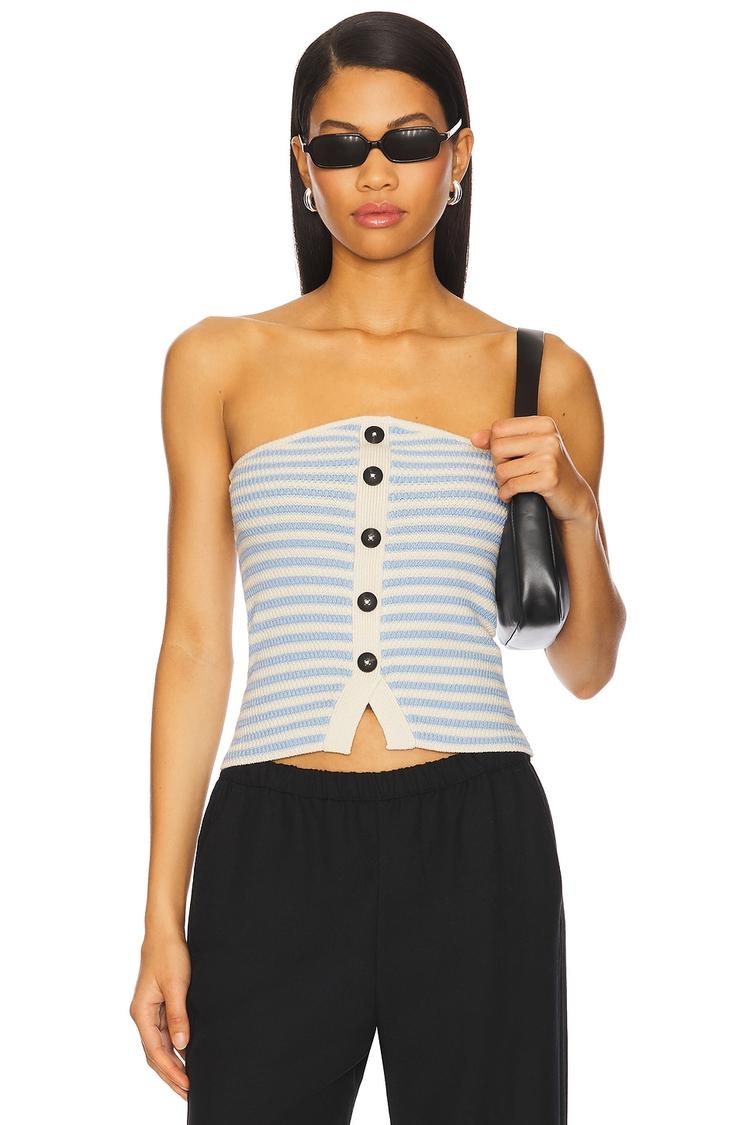 Delicate stripes and a button-front detail define this fitted bandeau corset top crafted from a midweight knit blend of viscose and polyester. The straight neckline and strapless design offer a sleek, minimalist silhouette perfect for warmer seasons. Its waist-length cut pairs effortlessly with high-waisted pants or skirts, making it ideal for casual outings, brunch dates, or night outs. This versatile piece brings a trendy yet classic touch to your wardrobe, embracing both comfort and style with its soft fabric and flattering fit.
