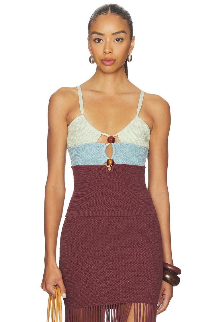 This fitted camisole top features a chic color-blocked design in matte burgundy, light blue, and cream hues, layered with a distinctive front cutout detail. Crafted from a stretchy viscose-polyester blend, it offers a comfortable pull-on fit with spaghetti straps and a flattering U-neckline. The ribbed hem adds subtle texture, making it perfect for warm spring and summer nights. Ideal for casual outings, night outs, and date nights, this modern and sexy top blends comfort with style effortlessly.